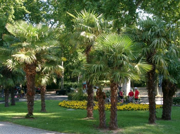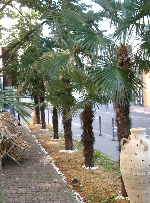 Trachies vor einem Cafe in der Innenstadt. Zumindest diesen Winter standen sie ungeschützt ausgepflanzt. Angeblich standen sie dort früher in Kübeln?