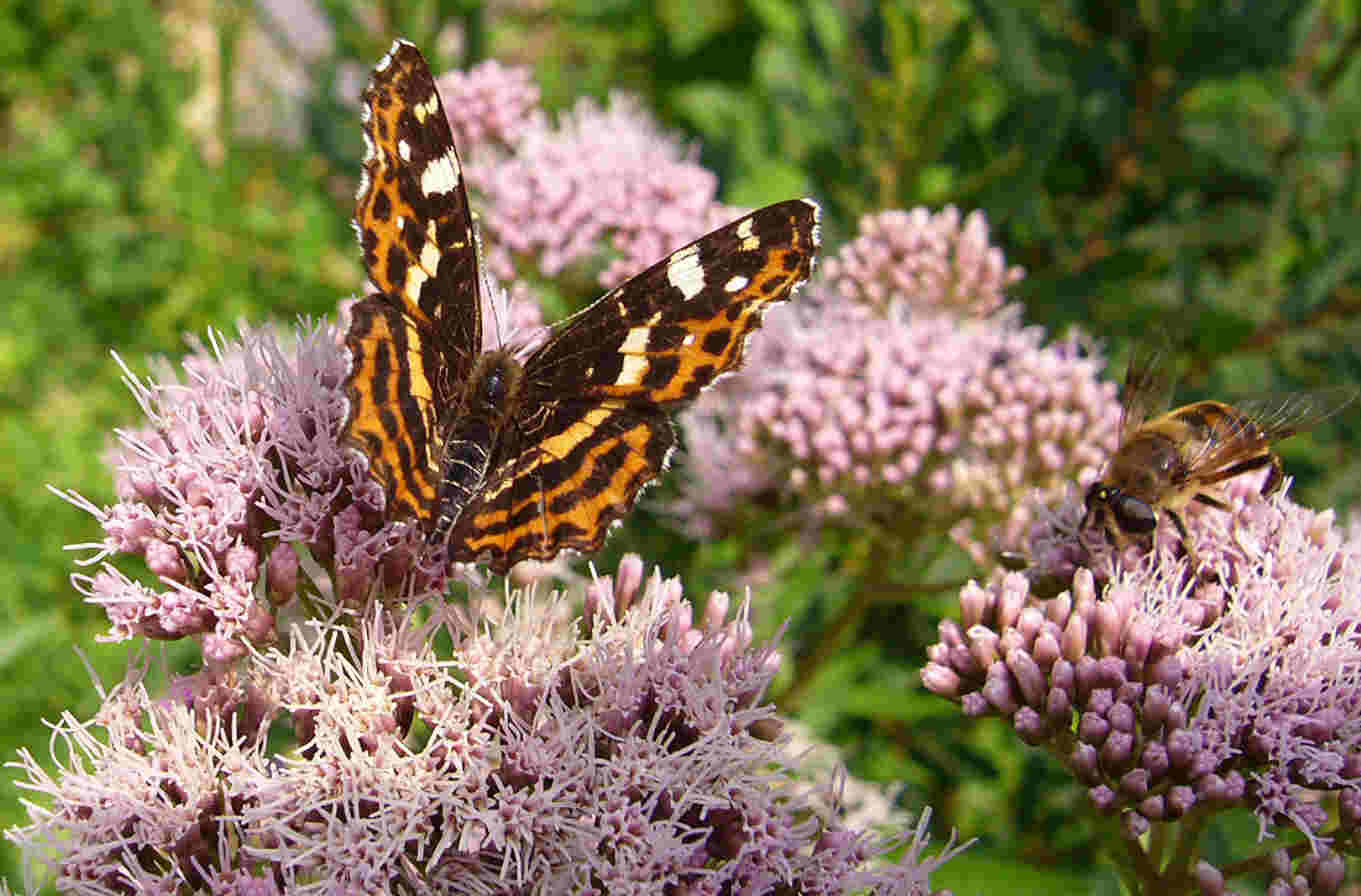 Auf /Eupatorium cannabinum*/ versammeln sich zahlreiche Insekten. Hier ein Landkaertchen-Falter und eine Biene. Die Bluetenbesucher wechseln sich lebhaft ab...