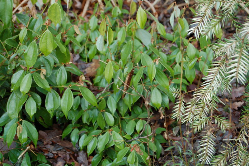 /*Lindera strychnifolia*/ neben Torreya taxifolia Argentea, beide haben sich bisher über Jahre als hart erwiesen!