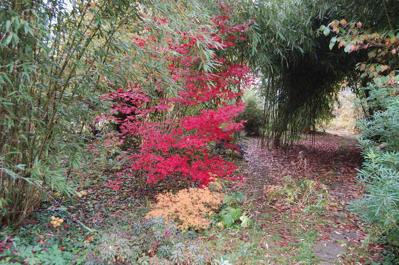 durch regelmäßiges "Rasenmähen" der neuen Bambustriebe hat sich ein Y-förmiges Tunnelsystem entwickelt. Im Vordergrund /*Acer palmatum Trompenburg*/ rot und vorne gelblich /*Acer palmatum Filigree*/, re Choisyaternata Aztec Pearl(ca 2m hoch)