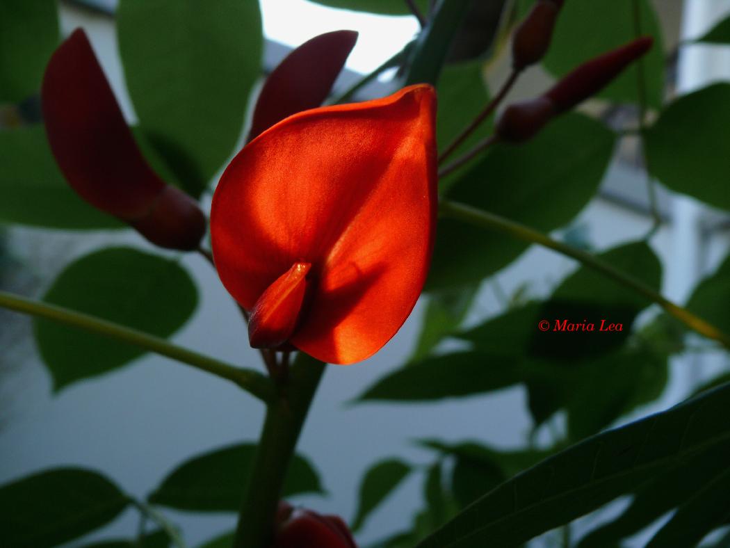 Kommt immer erst spät zur Blüte - Korallenstrauch 'Erythrina crista-galli' bei uns als Kübelpflanze auf der Terrasse.
