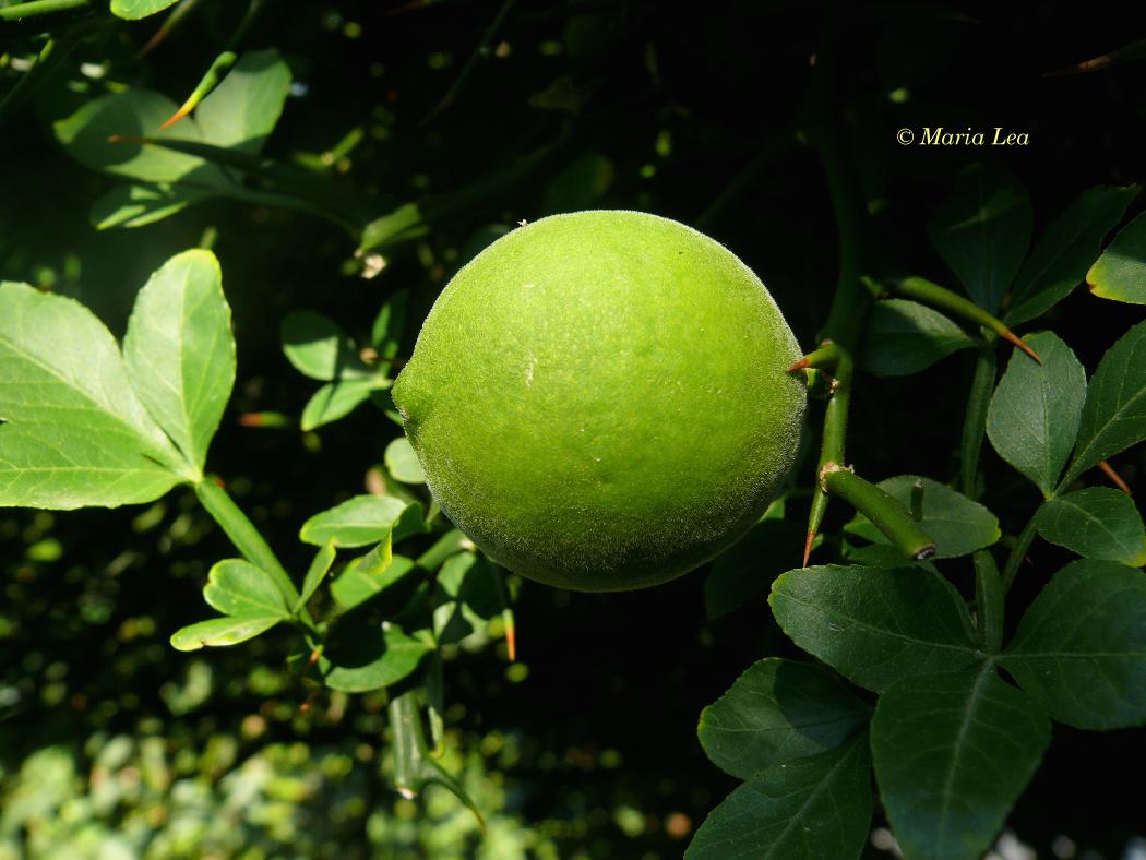 Noch grüne Frucht von einer dreiblättrigen bitteren Orange 'Poncirus trifoliata' seit 1992 als Hochstamm in unserem Garten.