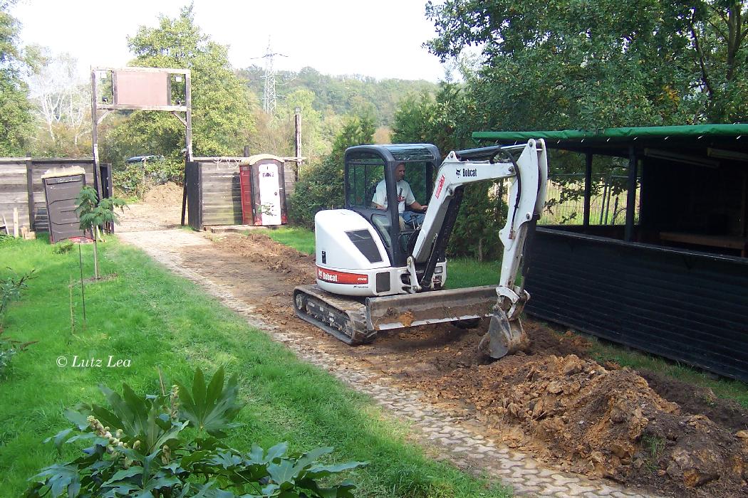 Ein Minibagger war nähmlich gerade dabei an der engsten Stelle seitlich am Gartenhaus den Graben zuzuschieben, wo eine Wasserleitung verlegt wurde. Heute montierte mir ein Bekannter den dritten und letzten Wasseranschluß auf dem Gelände.