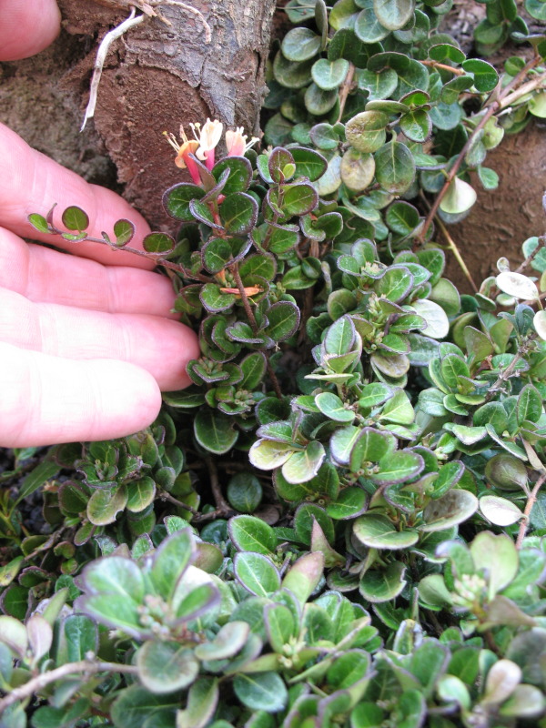 /*Lonicera crassifolia 'Little Honey'*/ #AM, ein mattenbildenes immergrünes Geißblatt mit dicken fleischigen Blättern. Komisch, das mir diese Pflanze bisher nie untergekommen ist. Natürlich habe ich sie mir sofort gesichert und versuchsweise im Garten und bei einem Kunden ausgepflanzt.