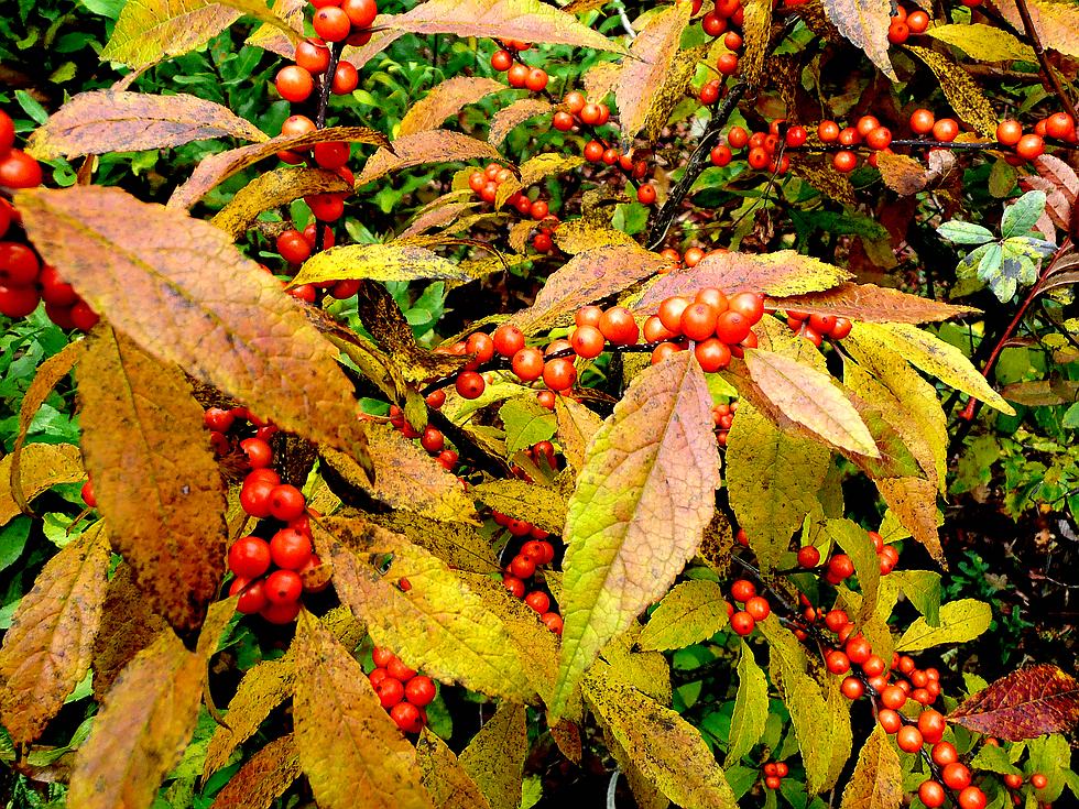 Besonders zierend sind auch die Früchte der /*Ilex verticillata*/, am schönsten kommen sie zur Geltung, wenn die Blätter abgefallen sind. Aber dann ist vermutlich alles in Amselmägen verschwunden, so dass ich schon jetzt meine Kamera darauf richtete:
