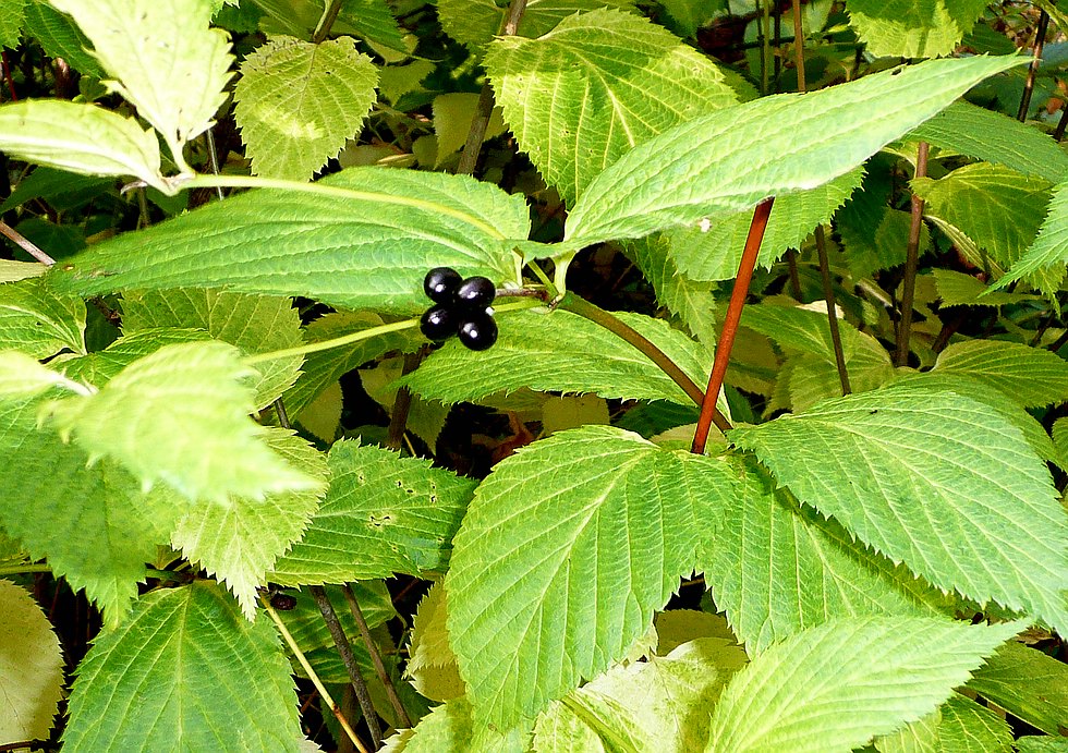 Vergleichsweise bescheiden, aber doch bemerkenswert sind die Früchte von /*Rhodotypos scandens*/, die sich sich im Quartett gesellen: