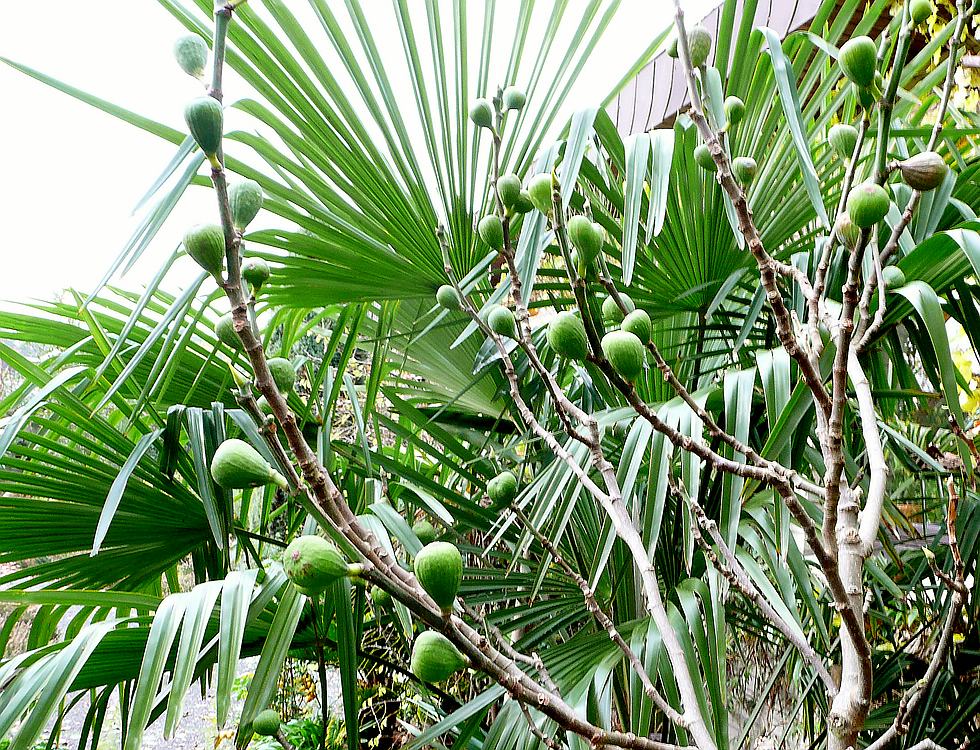 Die zweite Generation der besonders reichfrüchtigen Bayernfeige (/*Ficus carica ‚Violetta’*/) wird nicht mehr reif. Aber auch nur eine Generation spendet angesichts der süßen violetten Feigen durchaus Freude. Dahinter ein Trachy-Ambiente.
