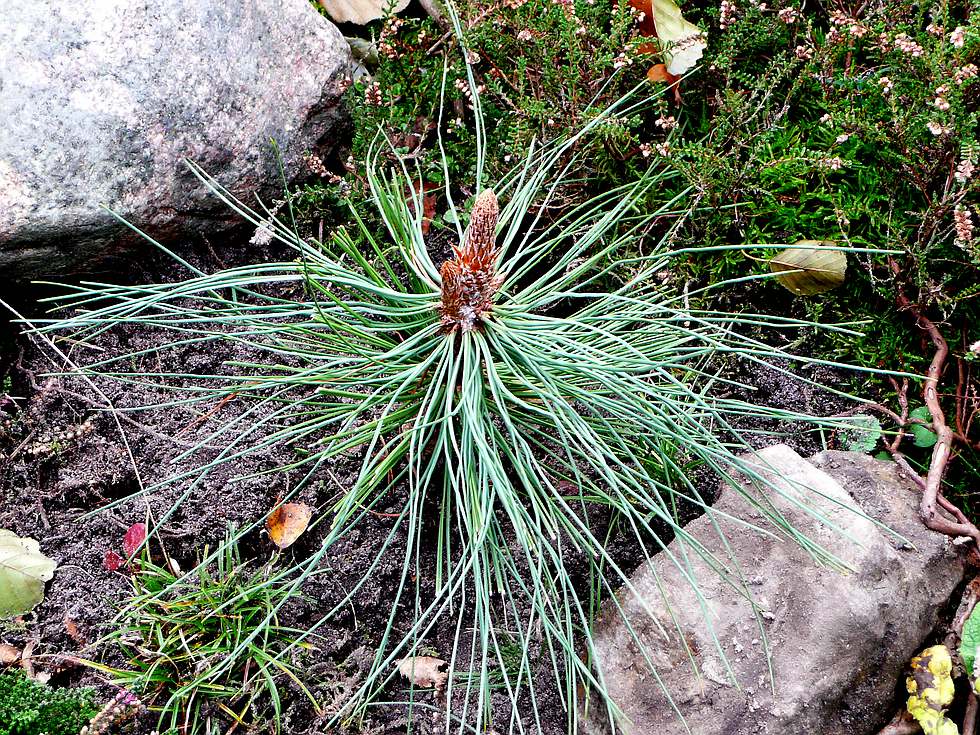 Zum Schluss noch (ohne Früchte) eine Neuerwerbung: /*Pinus jeffreyi ‚Joppi’*/. Der Knirps hat 20 cm lange Nadeln und ist total winterhart.