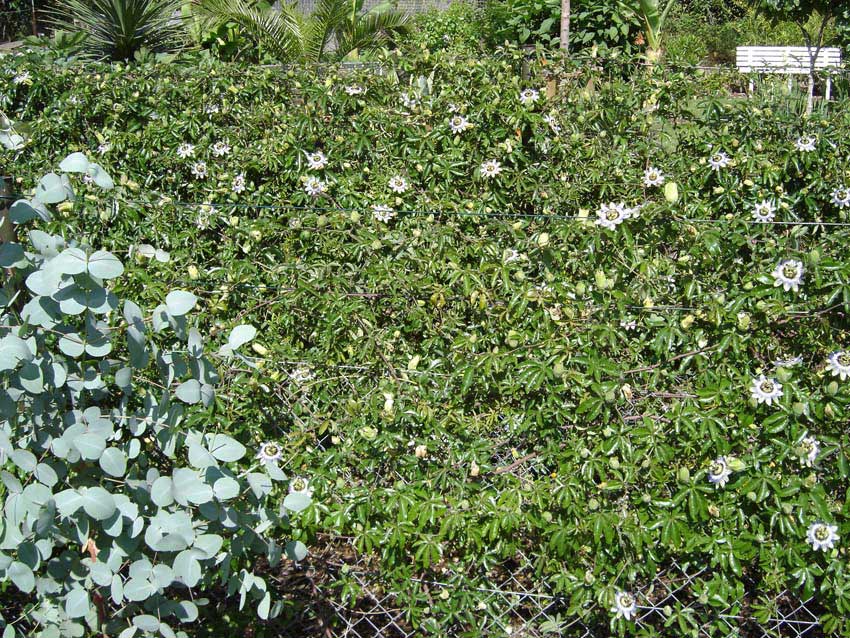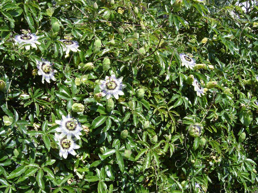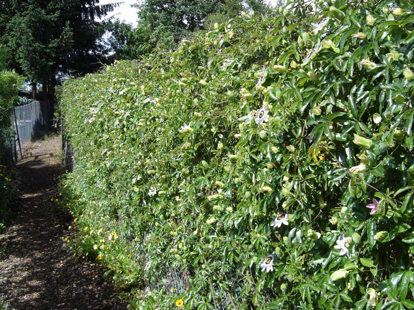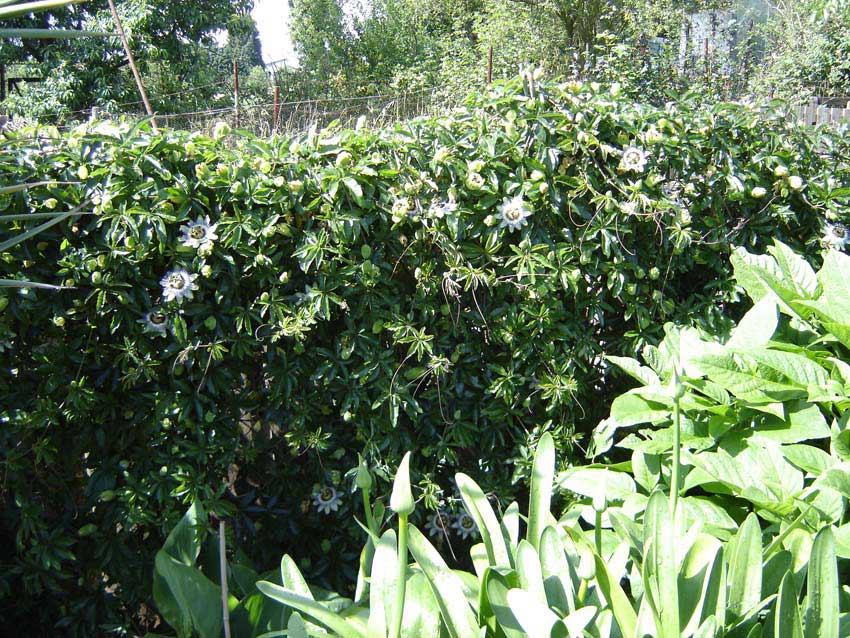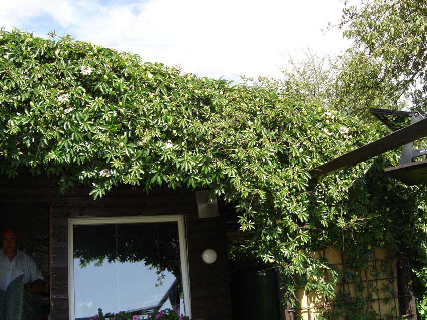 Passiflora caerulea haben mittlerweile fast alle Zäune und das Gartenhaus zugerankt.Sie blühen unermütlich nachdem sie den Winter schadlos überstanden haben.