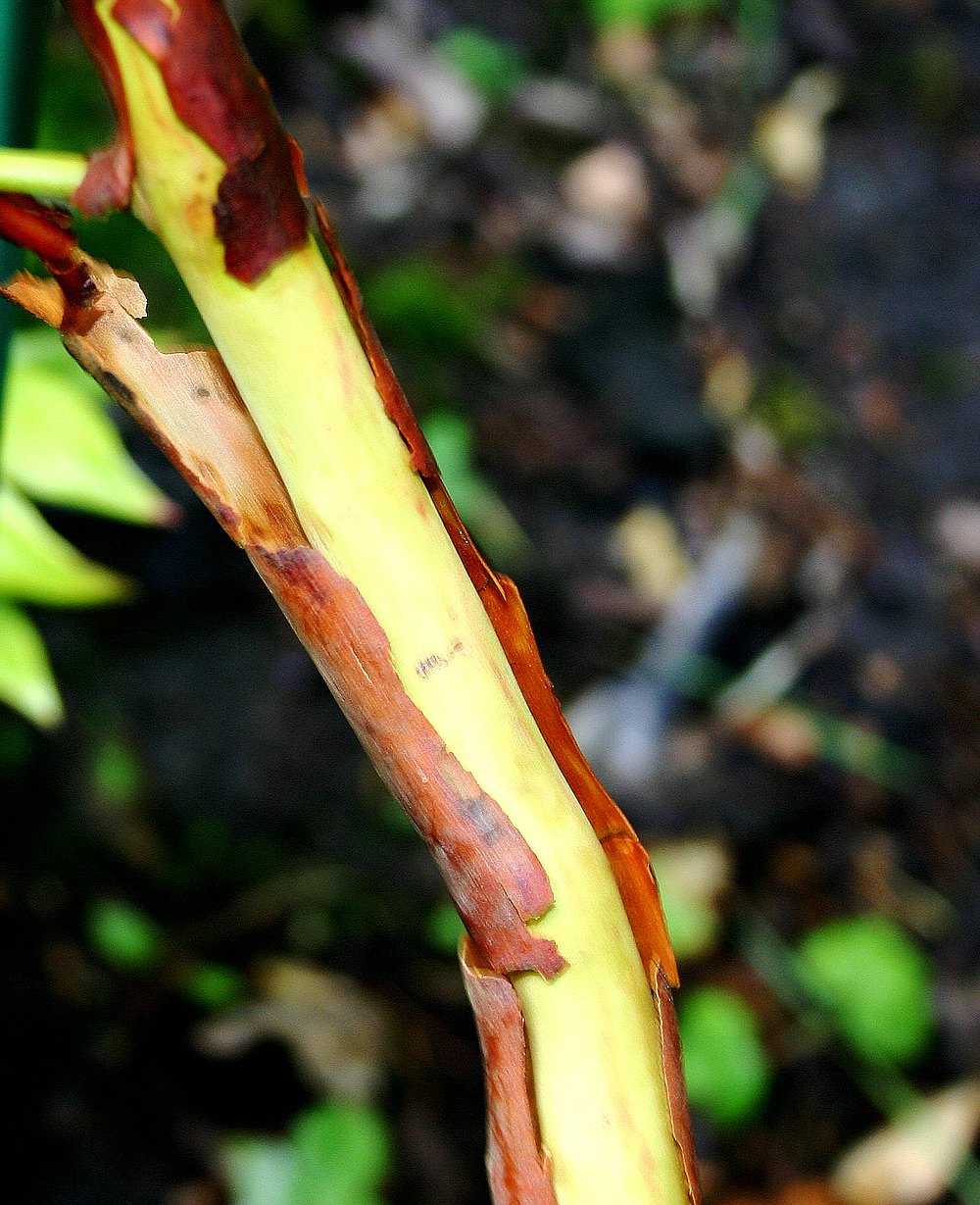 ..dieses ist die abblätternde Borke des Amerikanischen Erdbeerbaums /*Arbutus menziesii*/, auch Madrone genannt. Wird in seiner Heimat bis 30 m hoch. Die nackte grüne Rinde, die unter der Borke zum Vorschein kommt, kann zunächst Besorgnis auslösen, dass da irgendetwas nicht in Ordnung sei. Aber die Madrone ist nun mal so….