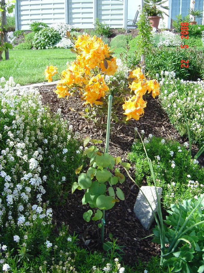 Im Vordergrund Cercis siliquatrum (Höhe bei Pflanzung 2005 ca. 5 cm), hinter der Azalee eine Maclura pomifera
