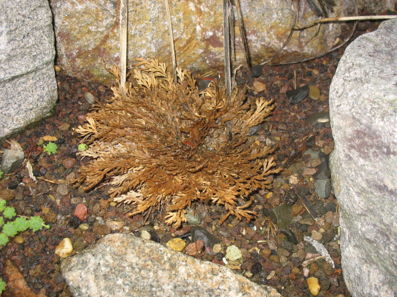 im zeitigen Frühjahr habe ich die Auferstehungspflanze, oder Falsche "Rose von Jericho" ausgepflanzt. So sah Selaginella lepidophylla letzte Woche nach dem Regen aus