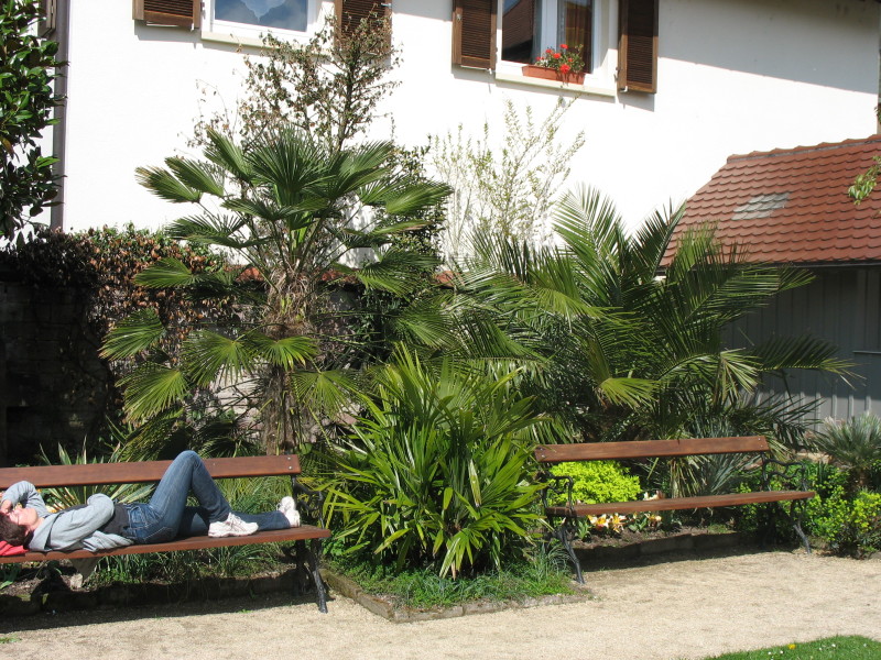 , T. wagnerianus, dahinter Fremontodendron (leider stark gestutzt, vermutlich wegen des Fensters), Rhapidophyllum hystrix, Jubaea, Chamaerops.