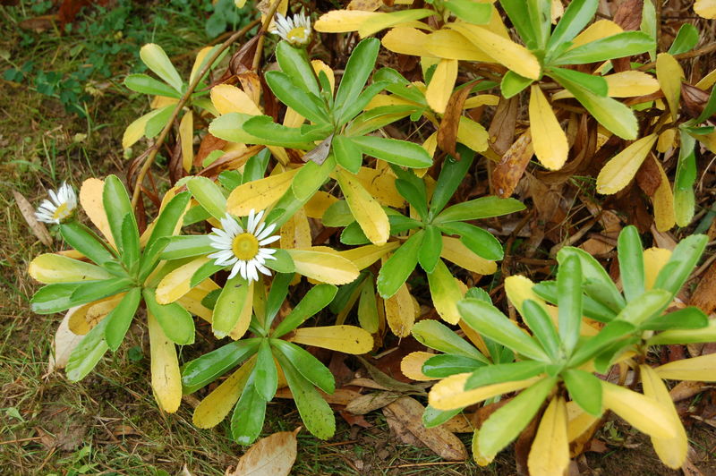 /*Nipponanthemum nipponicum*/, ein immergrüner Halbstrauch aus Japan entwickelt im Herbst nicht nur schöne Blüten, er "strahlt" auch sternförmig durch seine älteren Blätter intensiv gelb