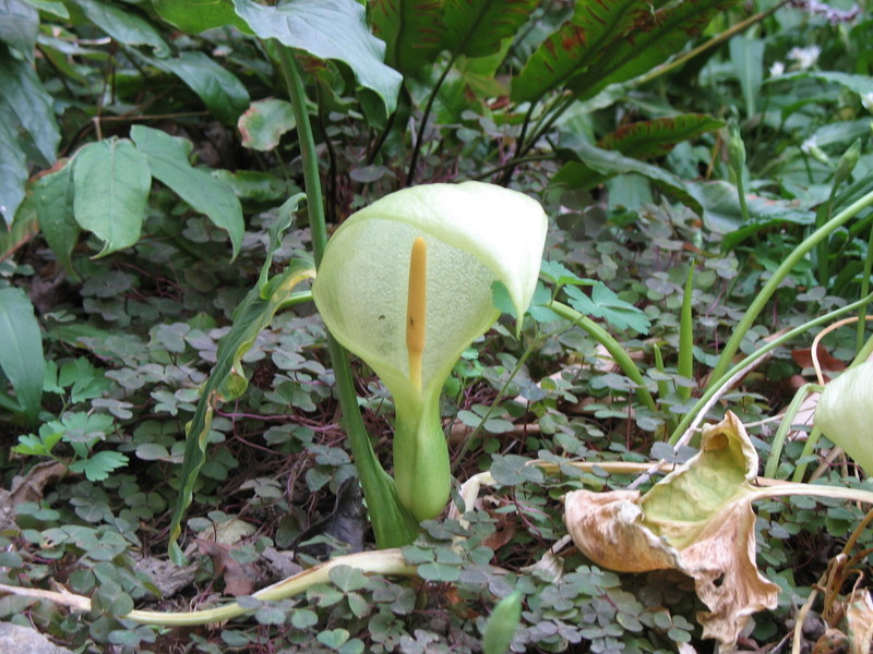 ein mir nicht weiter namentlich bekannter Aronstab von Mallorca. Dort überall im Winterhalbjahr ein häufiges "Unkraut". Treibt auch hier bereits im Herbst aus, bleibt über Winter grün (hält aber oberirdisch keinen starken Frösten stand) und zieht über Sommer ein