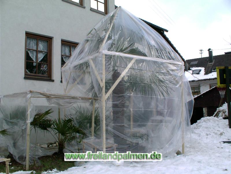 super Winterschutz. Genauso in der Art verfahre ich auch, wenn ich schütze. In den meisten Wintern gibts bei mir keinen Schutz, nur in sehr kalten mit langem Dauerfrost und/oder bei Neupflanzung. So habe ich z. B. meine "große" mit 2 m Stamm gepflanzt und die ersten beiden Winter mit folgendem Winterschutz geschützt, damit ihr das Einwuirzeln, Akklimatisieren erleichtert wird. Die Sieten wurden nur in der kältesten Zeit zugetackert und vorne an der Südseite wurde am Tag immer gelüftet. Das ist das a und o. Seit letzten Winter hat sie ohne Schutz mit etwas Mulch ohne Probleme überstanden. Wie man sieht gibt es auch in dem Schwarzwaldtal einiges an Schnee. Genau das ist z. T. das Problem. Wenn das Dach nur aus Plane/Folie besteht, muß es entweder wie bei meinem Schutz geringe Auflageflächen und/oder steile Flächen haben, damit die Schneelast das Dach nicht eindrückt. Das Problem hatte ich nähmlich auch schon bei Dächern, die ziemlich flach waren.