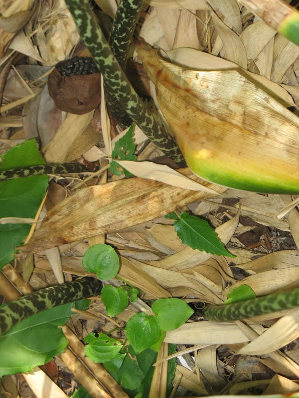 man muss schon tief unter die Blätter schaun um den kugeligen Fruchtstand von Typhonium (Sauromatum) venosum zu entdecken. Und daneben? Sind wohl Sämlinge aus den letztjährigen Früchten??? Kann mir an dieser Stelle sonst nichts anderes vorstellen.