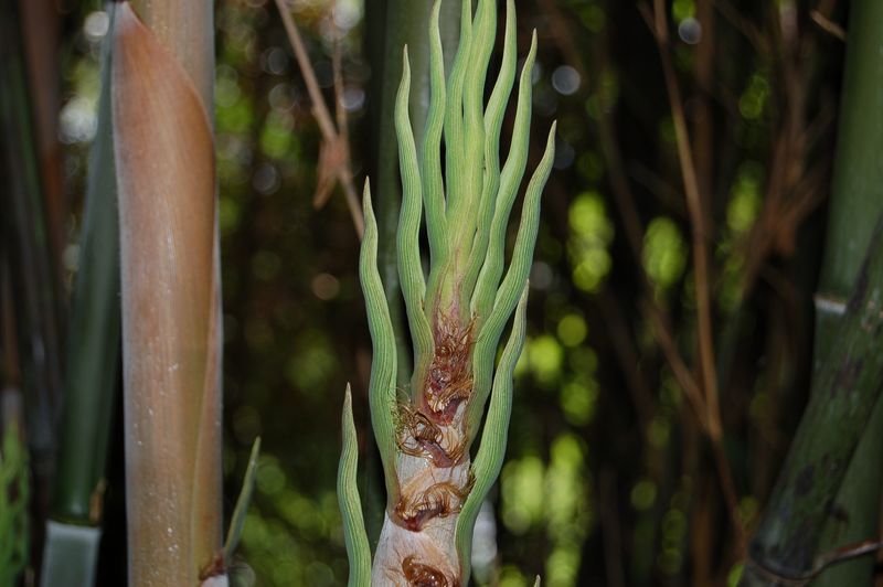 Wie ein futuristisches Flammenschwert schiebt /*Phyllostachys nigra Boryana*/ seine ca 4cm dicke Halmspitze in den Himmel