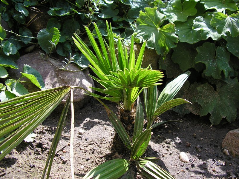 die kleine, ziemlich zurückgefrorene Zwergpalme gibt sich Mühe, wieder wie eine Palme auszusehen.