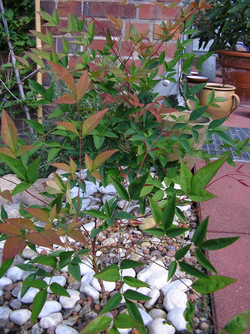 auch Nandina domestica, ohne Schäden durch den Winter gekommen, erfreut mit dem Farbenspiel der Blätter und gutem Wachstum
