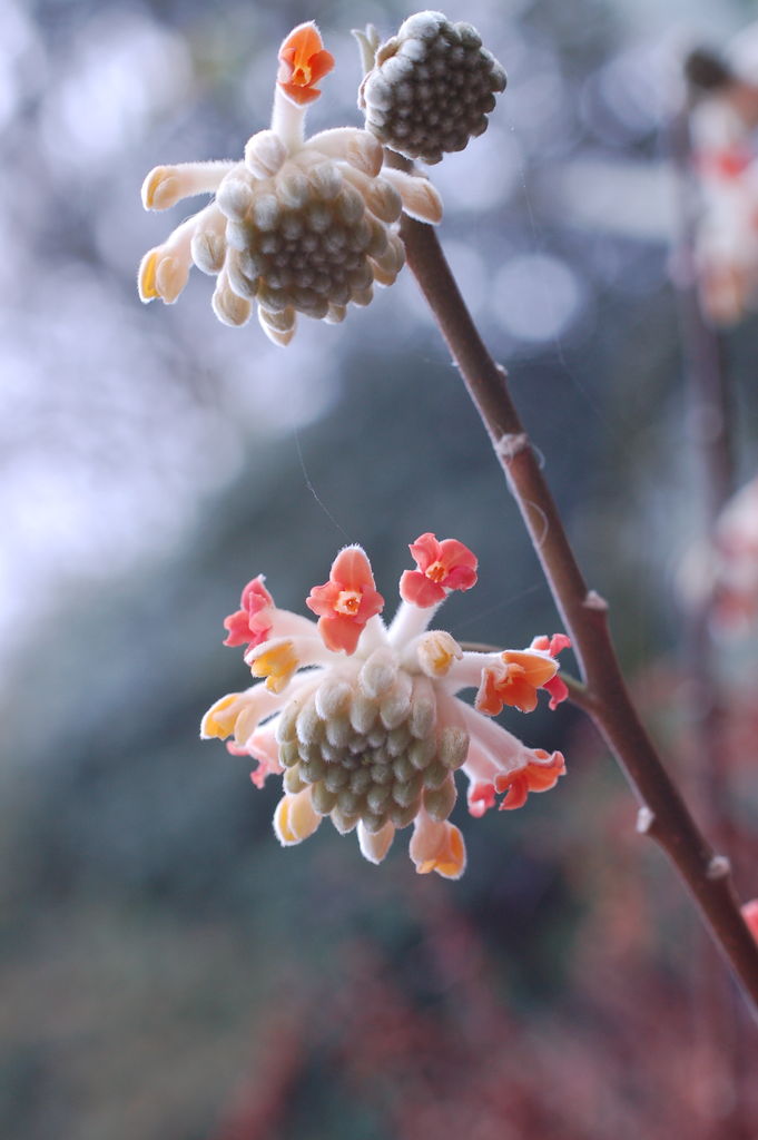 /*Edgeworthia chrysantha 'Red Dragon'*/, hier schon mehrfach gezeigt, wird im Laufe der Blühdauer immer intensiver rot!....als ob sie sich schämen würde![]()