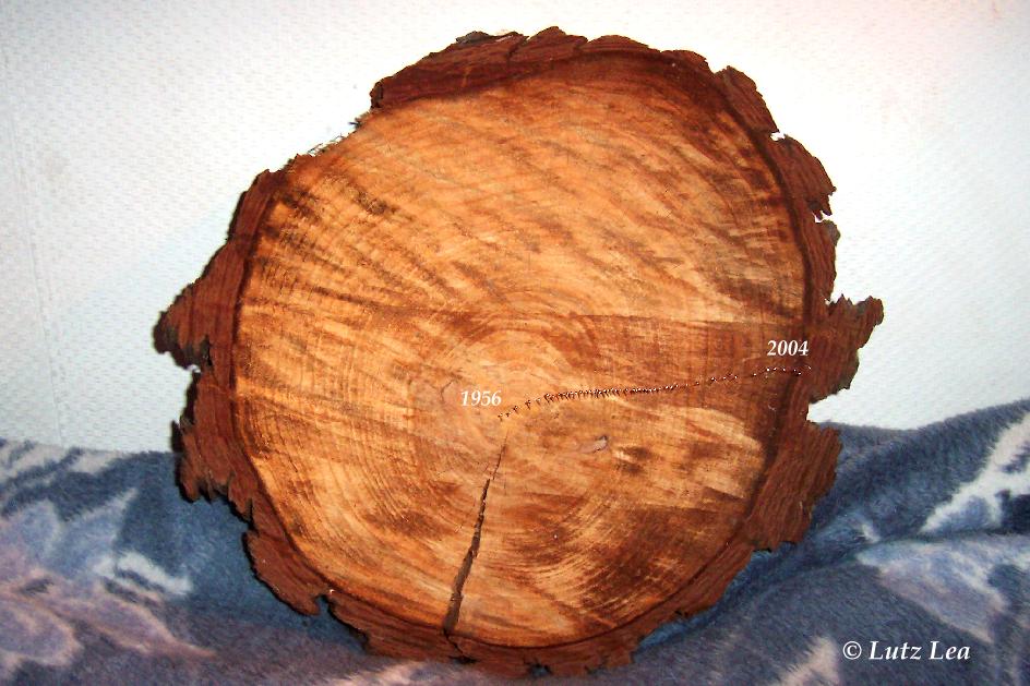 Schade um das Prachtexemplar. Den letzten Jahresring habe ich bis bzw. als 2004er gezählt!
