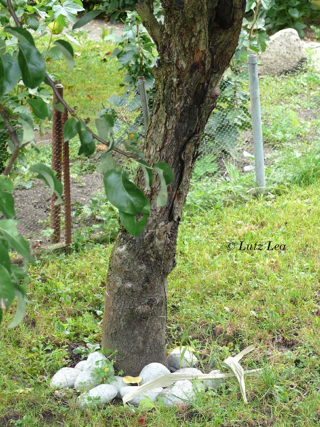 Der schon starke Stamm kann sich sehen lassen. Deutlich erkennt man die Veredelungsstelle.