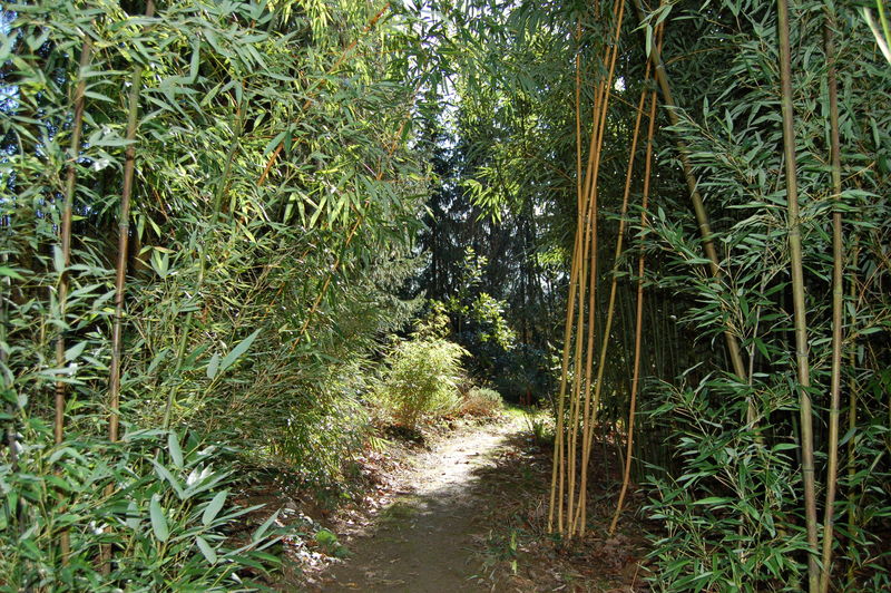 /*Fargesia rufa*/ und /*Fargesia dracocephala*/ li am Weg, re Phyllostachys-Arten, hinten i.d.Mitte Quercus rhysophylla