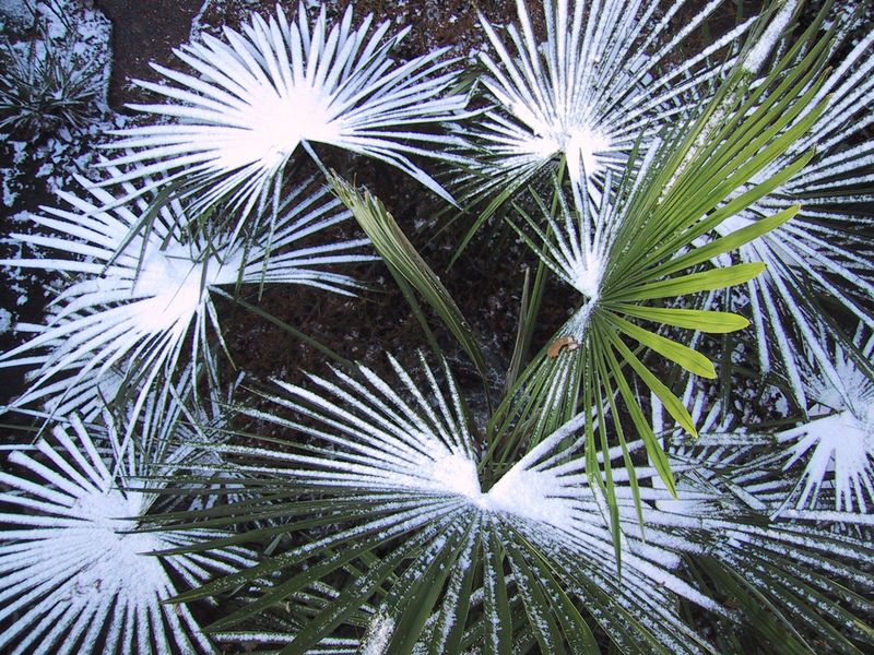 Extrem dekorativ mit feinen Schneeflocken bestäubt: eine Aufnahme vom Balkon herunter auf wagenrad(!!)große Blätter!