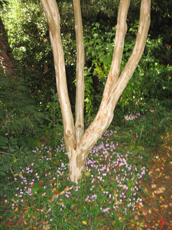am Fuße einer anderen großen Lagerstroemia blühen Cycamen hederifolium. Eine passende Kombination!