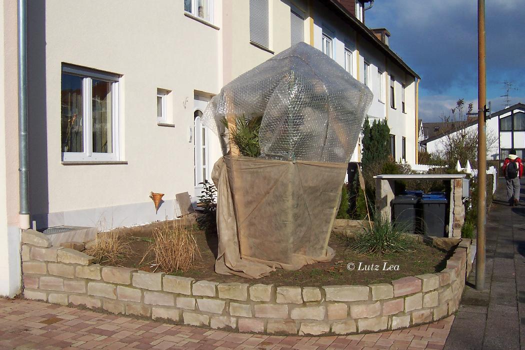 Eine mehrstämmige "Chammi" verbirgt sich unter dieser Winterverbauung in Sprendlingen!