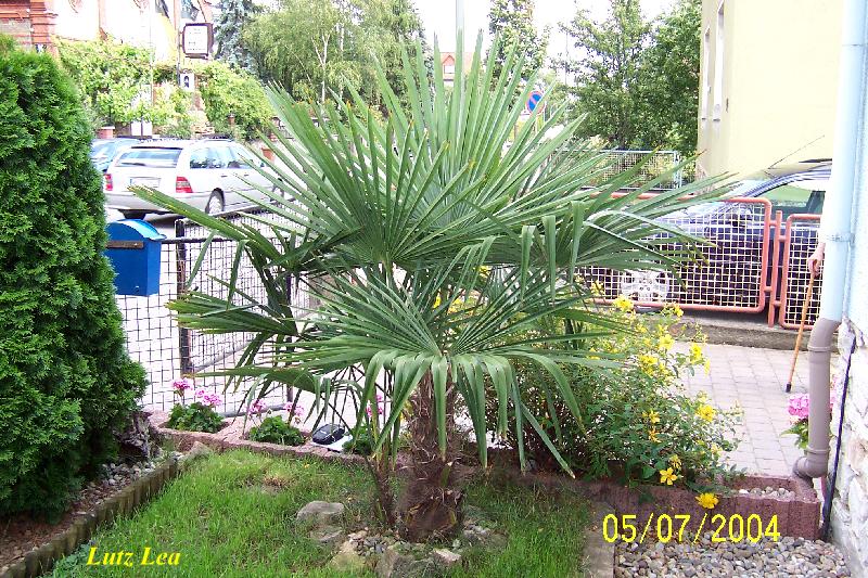 ... zeigt eine weitere Hanfpalme (und eine kleinere am Stamm) im selbigen Vorgarten, welche ca. 1985 ausgepflanzt wurde(n).