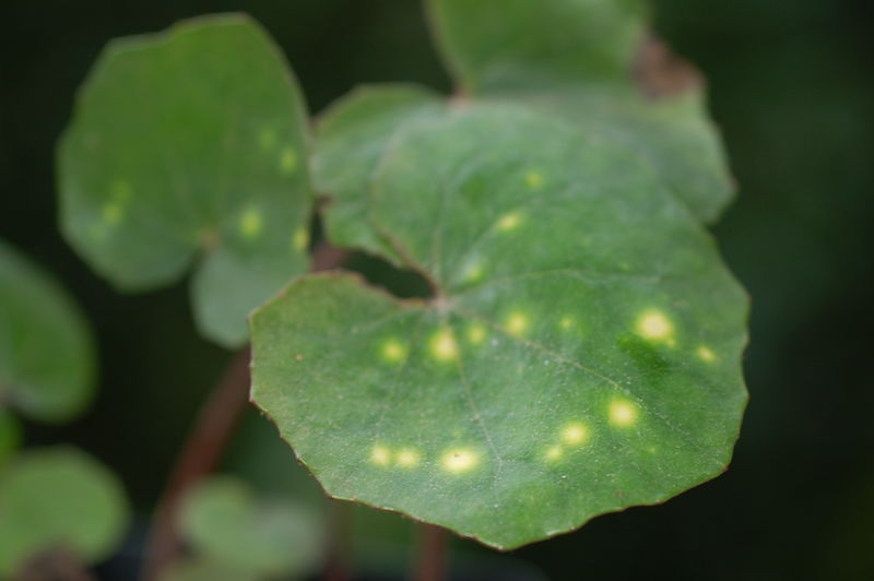 ,so imponieren die gelben Punkte dieser Selektion von /*Farfugium japonicum*/, die auch schon hier gezeigt wurde (leider auch etwas unscharf: hatte die Brille vergessen! ;-)