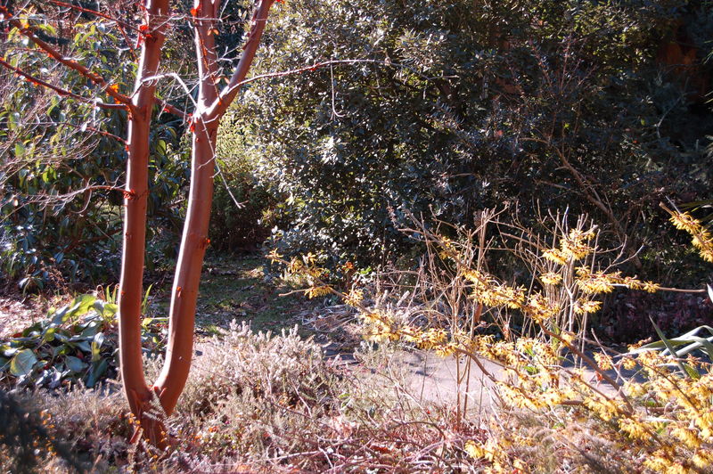 habe an verschiedenen Stellen des Gartens Hamamelis-Sträucher gesetzt, um auch im Winter ein "ständig blühendes Flair" zu schaffen. Im Hintergrund die ca 4bis5m hohe Quercus ilex rotundifolia
