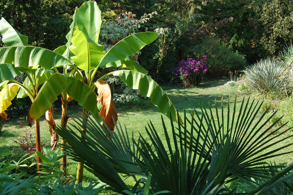 /*Musa basjoo*/ neben Yuccas und Trachy