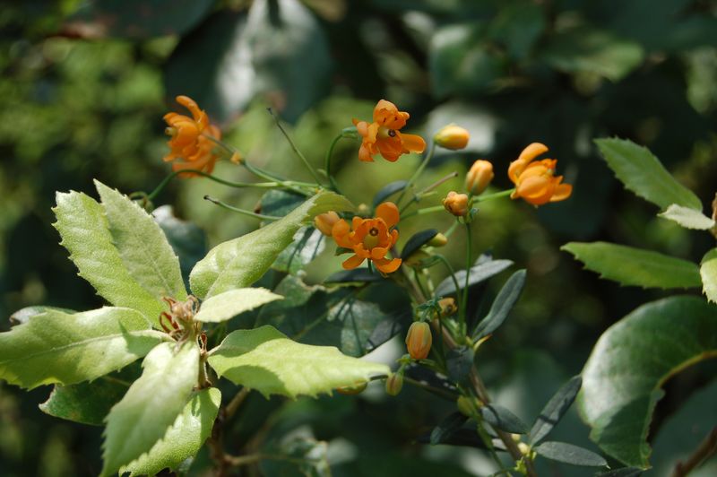 Remontierende Blüten der südamerikan./* Berberis linearifolia Orange King*/vor einer rundblättrigen Form von Quercus ilex