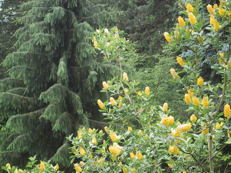 Blick vom Balkon in den Garten auf Picea breweriana u. den ca 5-6m hohen Argyrocytisus battandieri-Baum mit seinen immergrünen silbrigen Blättern.Der ananasähnliche Duft ist z.Zt. unbeschreiblich!