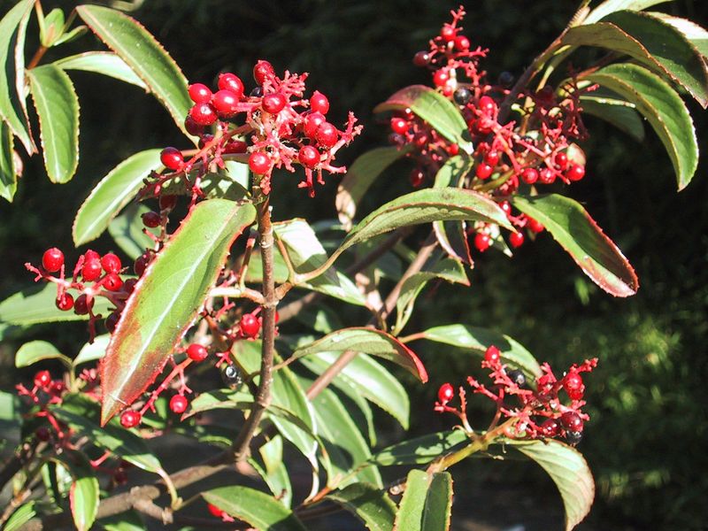 Korallenroter Fruchtstand der immergrünen chin. Viburnum henryi
