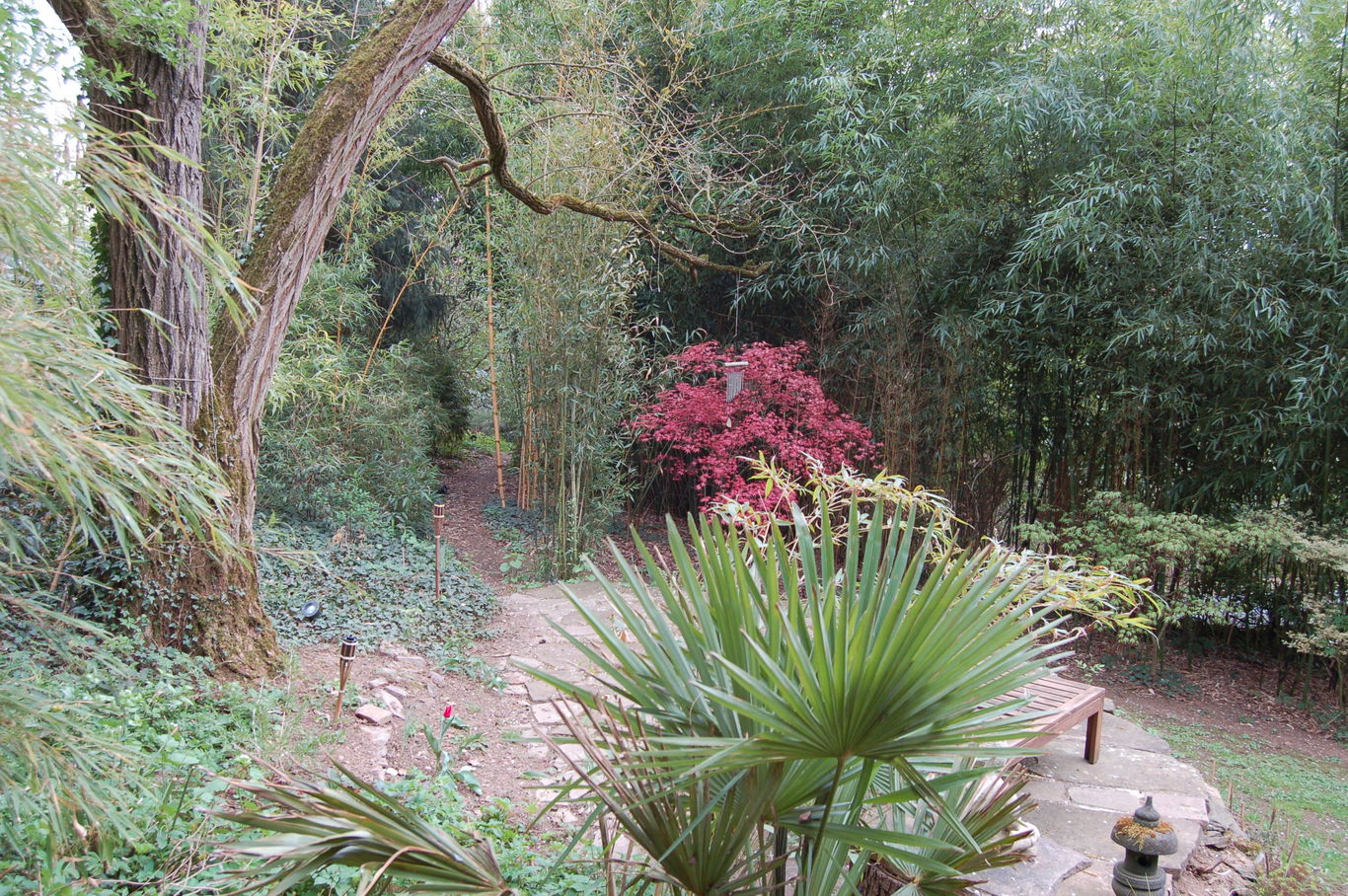 ..im 2.Bild (hinter dem Haus, leider ohne Sonnenlicht) leuchtet ebenfalls ein "frühjahrsbunter" Ahorn: /*Acer palmatum Deshojo*/#AM)
