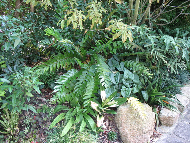 von heute. Cyrtonium falcatum mit Dryopteris sieboldii (rechts), zusammen mit Rohdeas, Asarum maximum, Pleione limbrichtii, div. Ophiopogon, Helwingia japonica (links)... unter Trochodendron araloides - eine weitgehend immergrüne Pflanzenvergesellschaftung