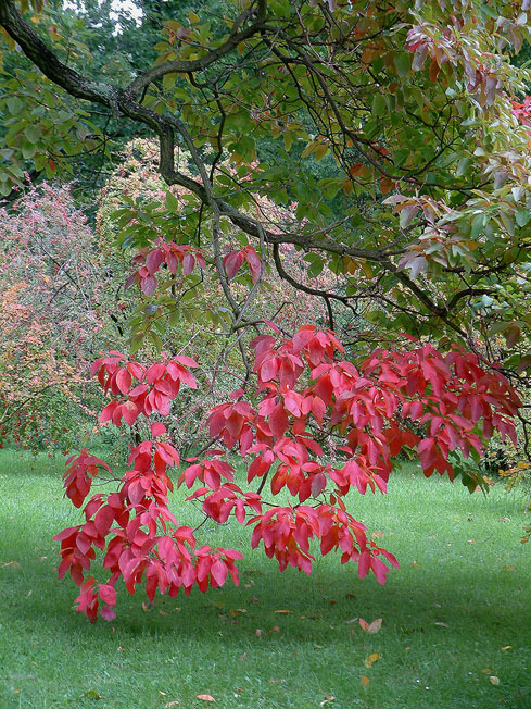 Dieser Ast, von dem hinteren der zwei Sassafras (von der Pergola aus gesehen), zeigt auch in den vergangenen Jahren zuerst die Herbstfärbung.