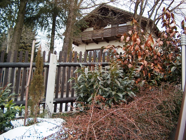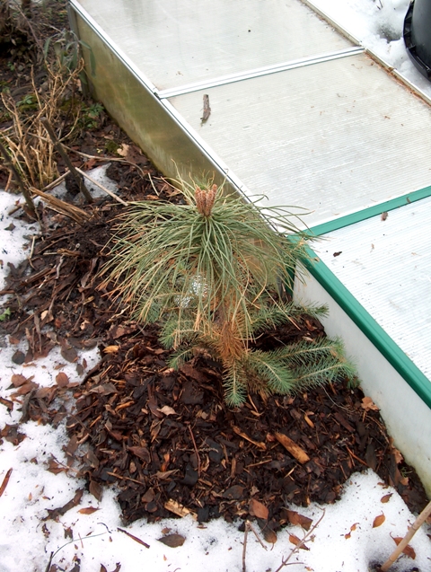 Prunus l. Caucasica rechts, davor eigene Selektionen und Cupressus sempervirens.