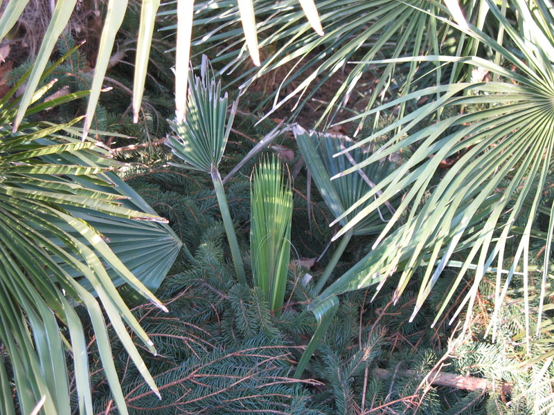 aus der Nähe und gut gemulcht. Insgesamt 5 Blätter sind zu erkennen, wenn man die angegammelten und das halbentfaltete mitzählt, fast schon Rekord für meine Pflanze. Nein, mit dieser Palme habe ich nach all den Jahren keine große Freude!