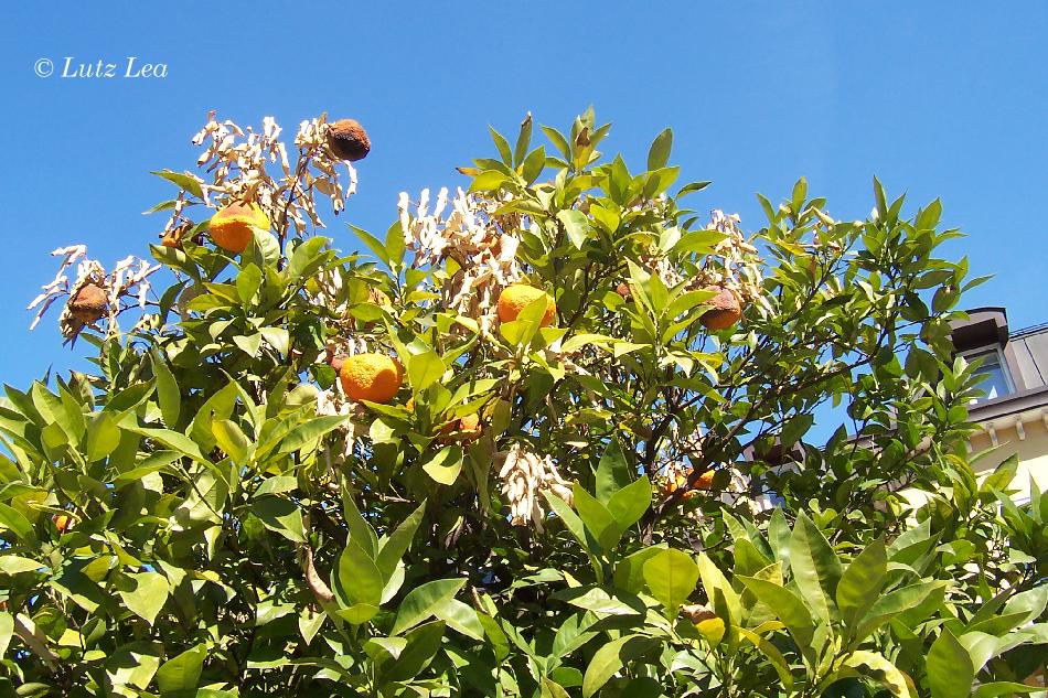 Deutliche Frostschäden im oberen Blattbereich bei diesem Zitrusgewächs auch vor der Villa Igea.