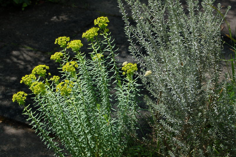 Mit ihrer architektonischen, strukturgebenden Gestalt gehört auch diese Euphorbie (/*Euphorbia seg. v. niciciana*/ unbedingt in den Exotengarten. Rechts daneben Ozothamnus rosmarinifolius Silver.