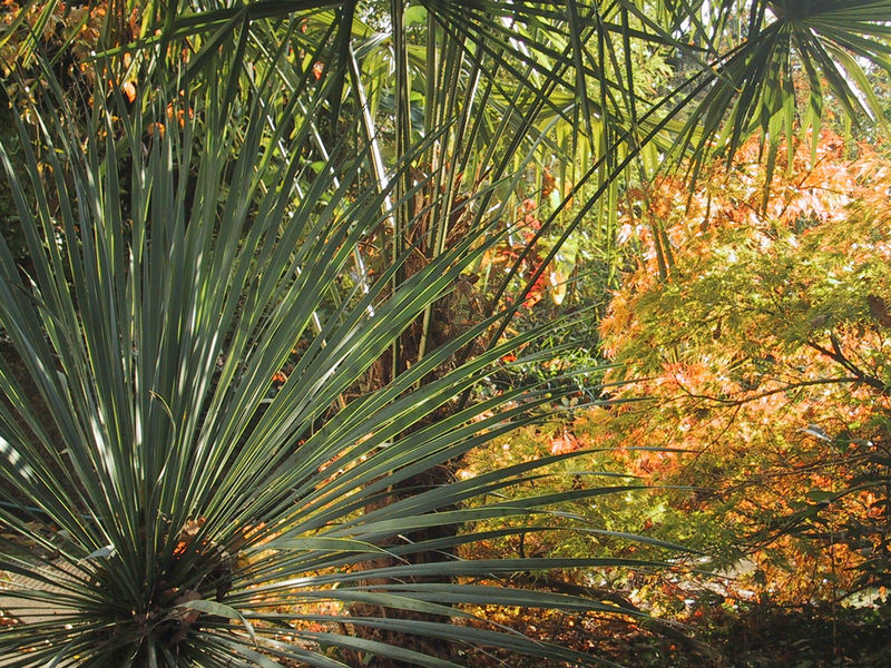 Ein Feuerwerk an brillianten Herbstfarben: /*Acer palmatum dissectum viride*/ neben Trachycarpus fort. und Yucca rostrata!! Wer ist die Schönste???