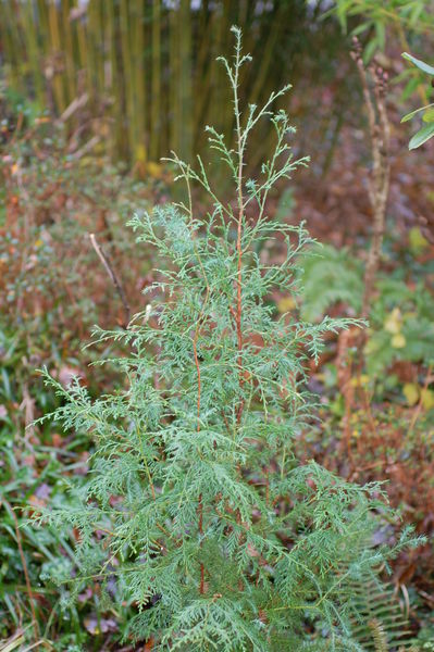 /*Chamaecyparis funebris*/ aus China (wurde früher zu Cupressus gezählt) entwickelt im Alter eine Trauerform vor Fargesia robusta