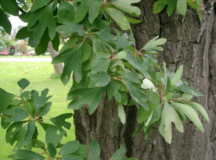 Gleich hinter dem Pocirus steht ein Exot aus der Lorbeer-Familie, den man hier sehr selten sieht, der Sassafras oder Fieberbaum /*Sassafras Albidum*/.