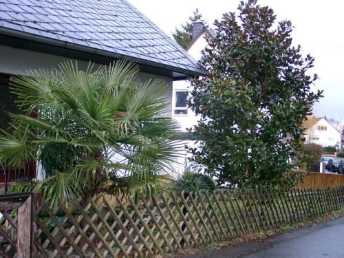 Nur ein ca. 200m von der Mainzer Zitrone entfernt wohnt der Mainzer Trachypionier, der bereits vor 1955 Trachies erfolgreich ausgepflanzt hatte. Hier ein Nachkömmling des 1996/97 gestorbenen Exemplars, daneben schöne große Magnolia grandiflora: