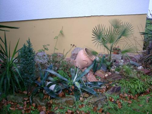 Neben der Trachy stehen einige ungeschützte Agaven, wo nur die äußeren Blätter hin sind. Hintendran eine Zwergpalme, völlig ungeschützt und unbeschädigt. Nicht den kleinsten braunen Fleck auf den Fächern: